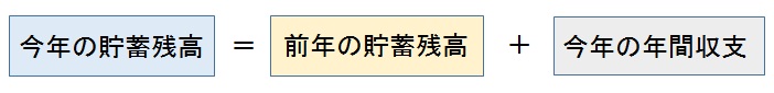 今年の貯蓄残高は前年の貯蓄残高に上記で算出した今年の年間収支を加えたものになります。これにより貯蓄の累積額が分かるのです。