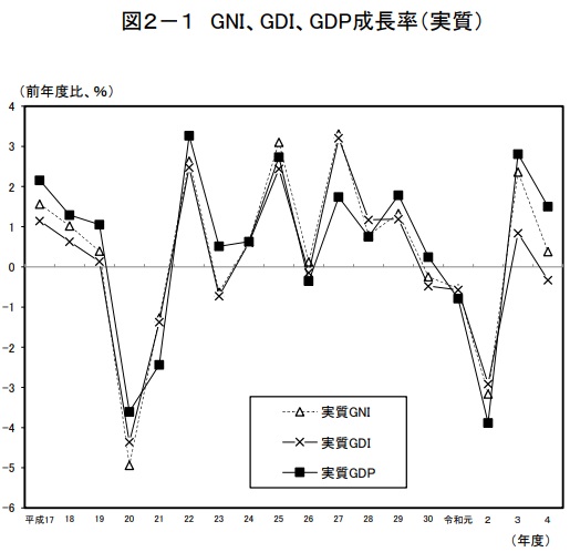・実質GDI(国内総所得・交易含む)は535.1兆円(前年度比0.3%減)と減少に転じました。