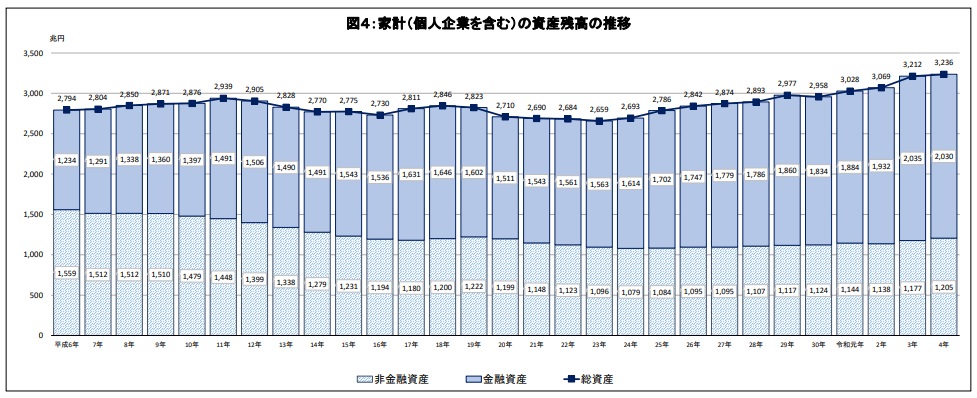 令和4年末の家計(個人企業を含む)の資産残高は3,235.5兆円であり、負債残高は381.2兆円でした。