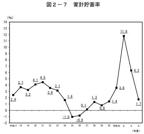 - 家計貯蓄率も2年連続で低下し、1.7%となりました。(前年度差4.6%減)