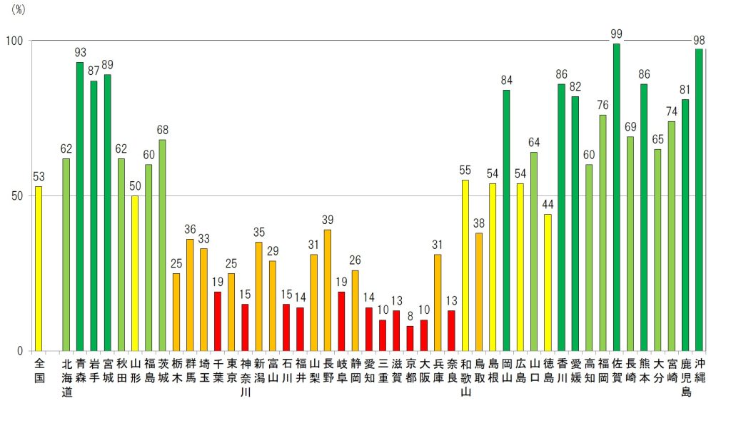 地籍調査が最も進んでいるのは佐賀県(99%)、遅れているのは京都府(8%)です。