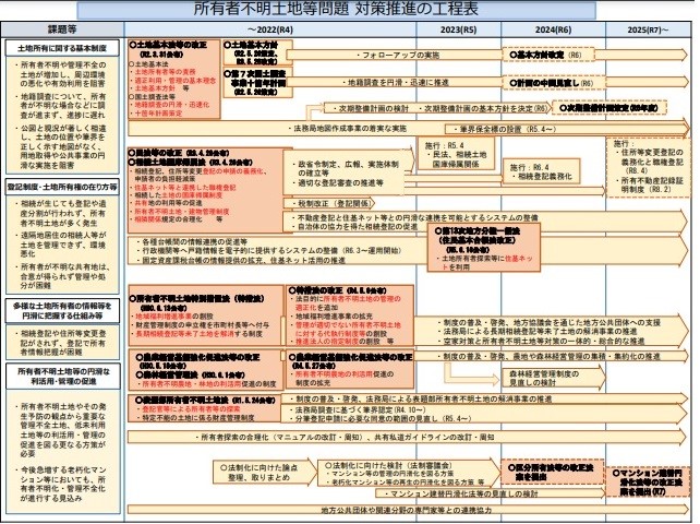 平成29年度地籍調査の結果によると不動産登記簿上で所有者の所在が確認できない土地の割合は約22%になっています。政府はこの問題に対してこのような工程で対処しようとしています。